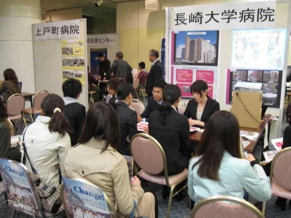 平成22年3月6日(土)長崎新聞文化ホールにて長崎県臨床研修病院合同説明会が開催されました。昨年までは本院が主催しておりましたが、今年は長崎県主催のもと、共催として県内16臨床研修病院が集まり、各病院によるプレゼンテーション、それぞれ個別ブースでの説明会が行われました。長崎大学病院ブースでは在籍中の研修医3名が説明を行い、学生34名の来訪がありました。学生にとっては関心のある病院の生の情報が得られ、研修病院にとってもそれぞれ学生にアピールできる、今回の合同説明会は双方にとってとても有意義な機会となりました。