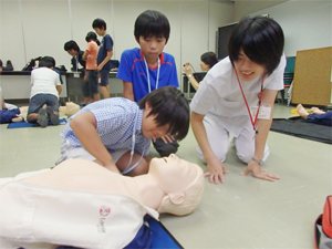 ●指導者 : 18 名 長崎大学病院(医師、研修医、看護師) ●ボランティア : 2名 東亜大学(医療学部 実習生) ●受講者 : 50名 小学生(5年生25名、6年生25名) ●協力 株式会社キシヤ 、日本光電九州株式会社 、山下医科器械株式会社、ジョンソン・エンド・ジョンソン株式会社 |