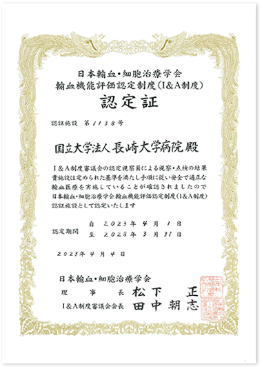 長崎大学病院は、日本輸血・細胞治療学会が実施する輸血機能評価認定(I&A)を2018年4月1日付で取得、2023年4月1日に更新しました。