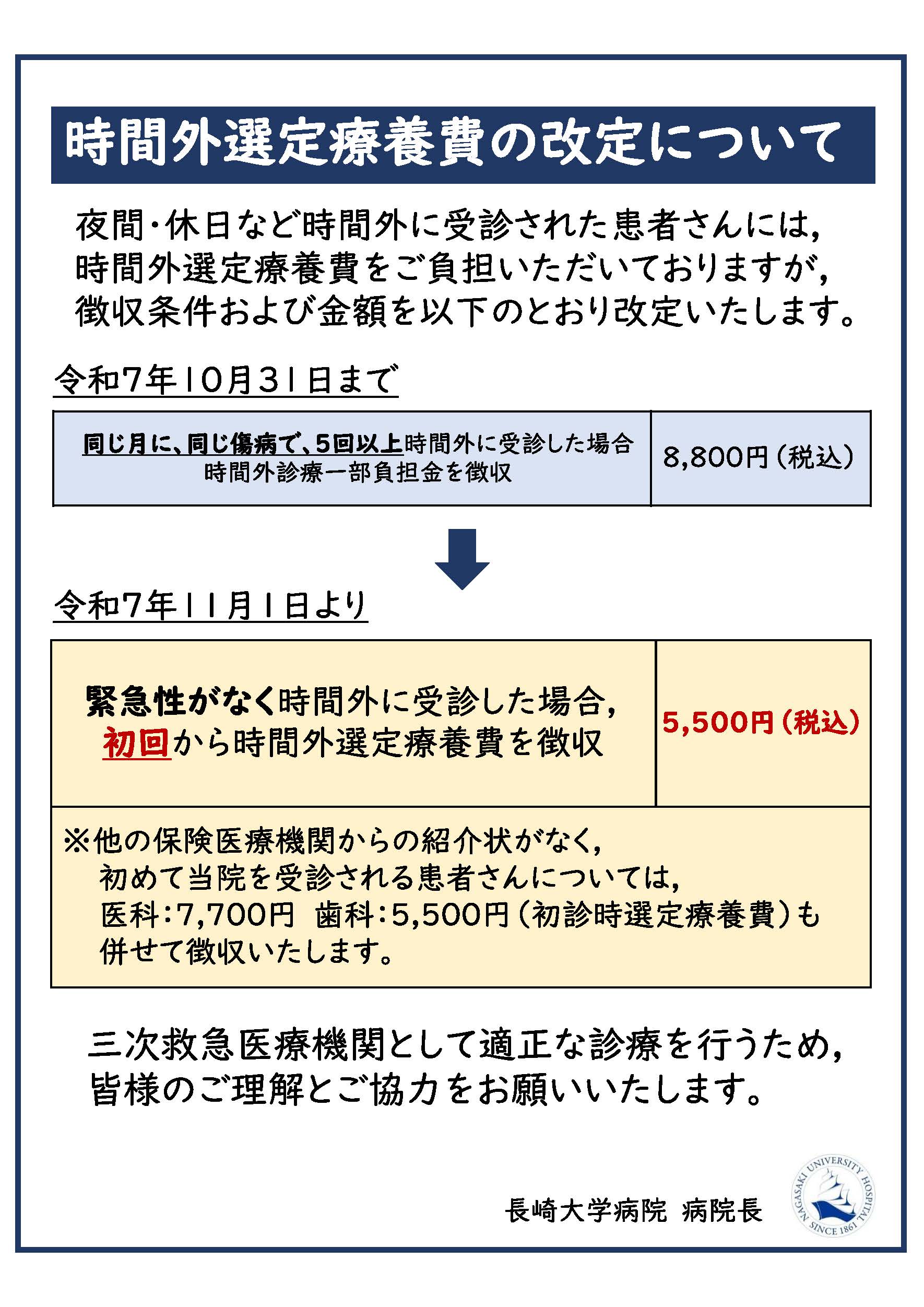 本院では令和7年11月1日から,夜間・休日などの時間外に受診された
