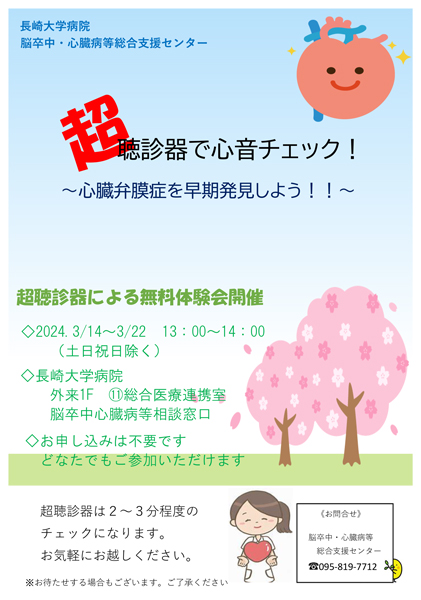 3/14~3/22までの土日祝日を除く6日間、13:00~14:00の間、超聴診器を使用した無料体験会を実施いたします。場所は長崎大学病院 1F ⑪総合医療連携室 脳卒中心臓病等相談窓口です。申込は不要です。どなたでもご参加いただけます。是非、この機会に心臓弁膜症のチェックを行ってみませんか?
