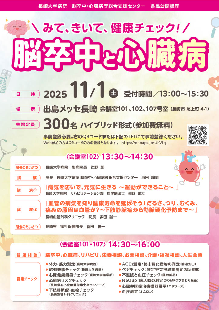 長崎大学病院 脳卒中心臓病等総合支援センターでは、今年度も県民公開講座「みて、きいて、健康チェック 脳卒中と心臓病」を開催いたします。専門家による講演と、実際に体験できる健康チェックを通して、病気の予防や早期発見につながる知識を楽しく学べる機会です。