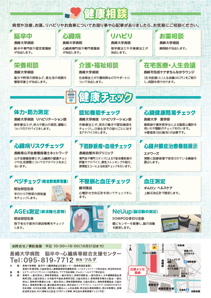 講演後には、さまざまな医療機器を使った健康チェックを実施します。特に今回は、長崎血管外科クリニックのスタッフによる携帯型エコーを用いた下肢血流の評価も行われます。さらに、長崎大学病院の専門スタッフが、脳卒中や心臓病に関する健康相談にも対応いたします。