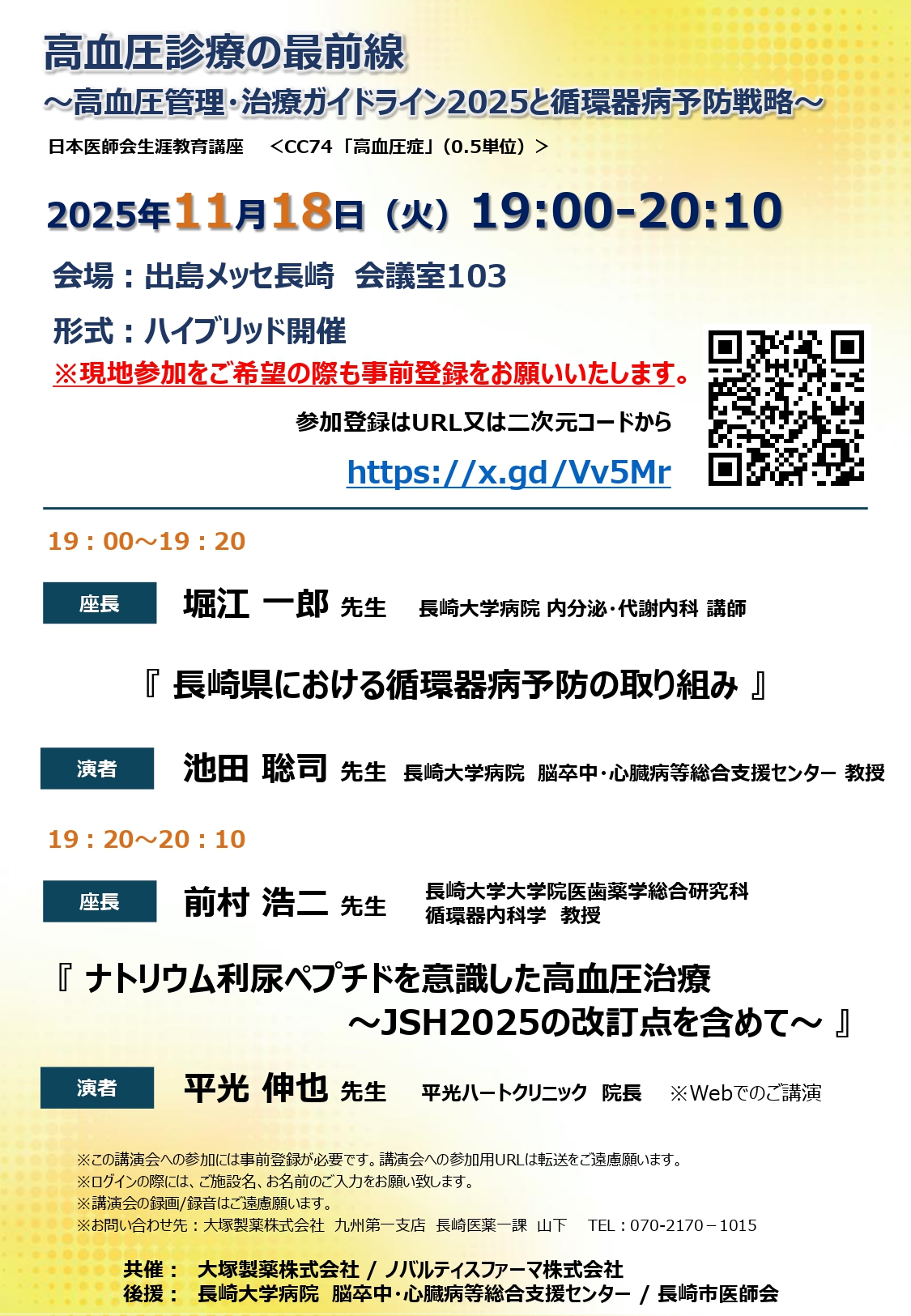 2025年11月18日(火)、医療従事者向け講演会「高血圧診療の最前線 ~高血圧管理・治療ガイドライン2025と循環器病予防戦略~」が開催され、現地参加5名、オンライン参加29名の先生方にご参加いただきました。