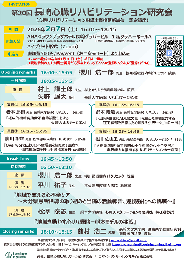 2026年2月7日に、ANAクラウンプラザホテル長崎グラバーヒルにおきまして、第20回長崎心臓リハビリテーション研究会が開催されました。
