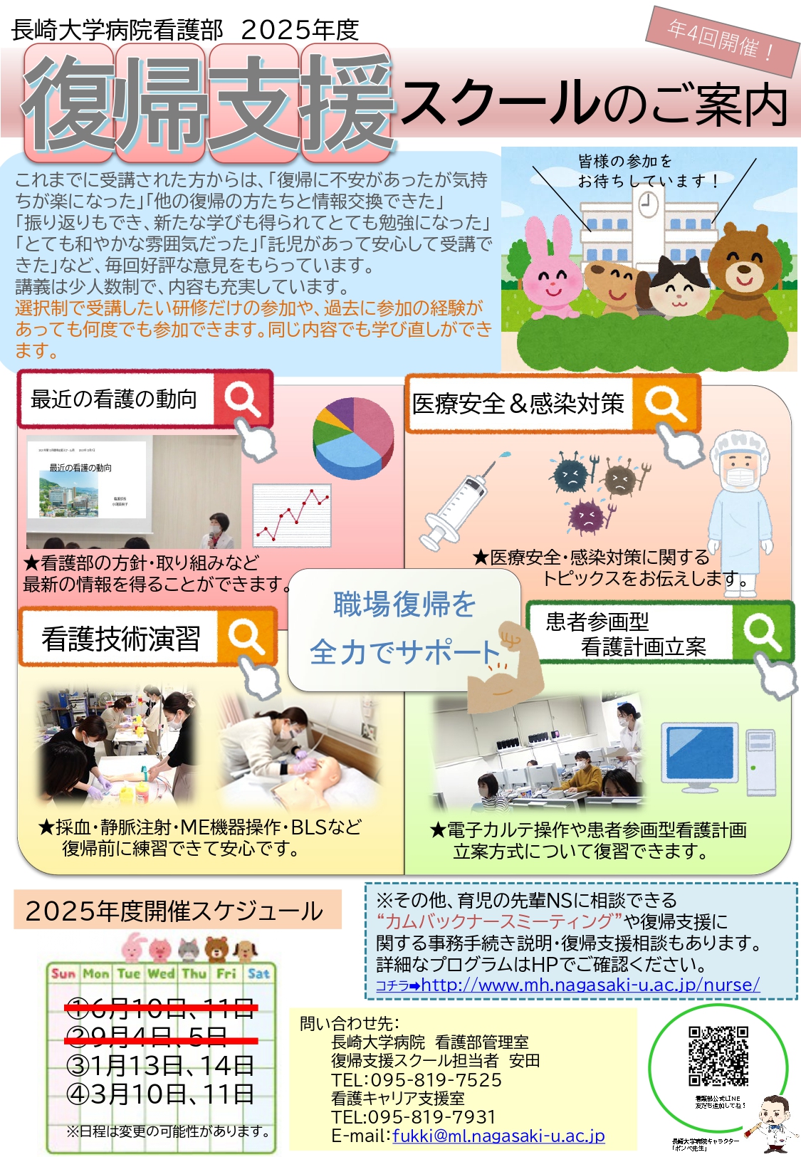 長崎大学病院看護部では、育児休業、自己啓発休業、病気休業、出向などで、しばらく病院から離れていた看護師のみなさんが安心して職場復帰できるような応援プログラムとして『復帰支援スクール』を行っています。