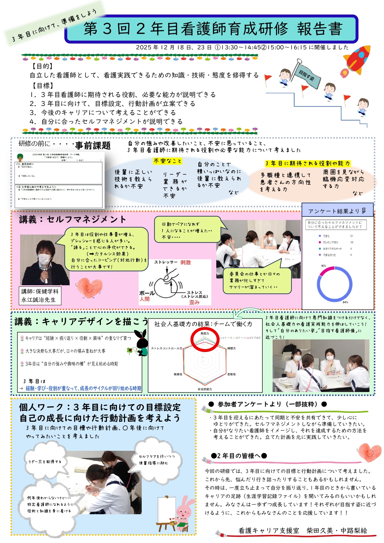 12月18日、23日に研修を行いました。3年目に向けての準備として、自分の強みや改善したいことを分析し、目標設定や行動計画を考えました。同期と不安や悩みを共有しながら今後のキャリアデザインについても考えました。詳細は報告書をご覧ください。