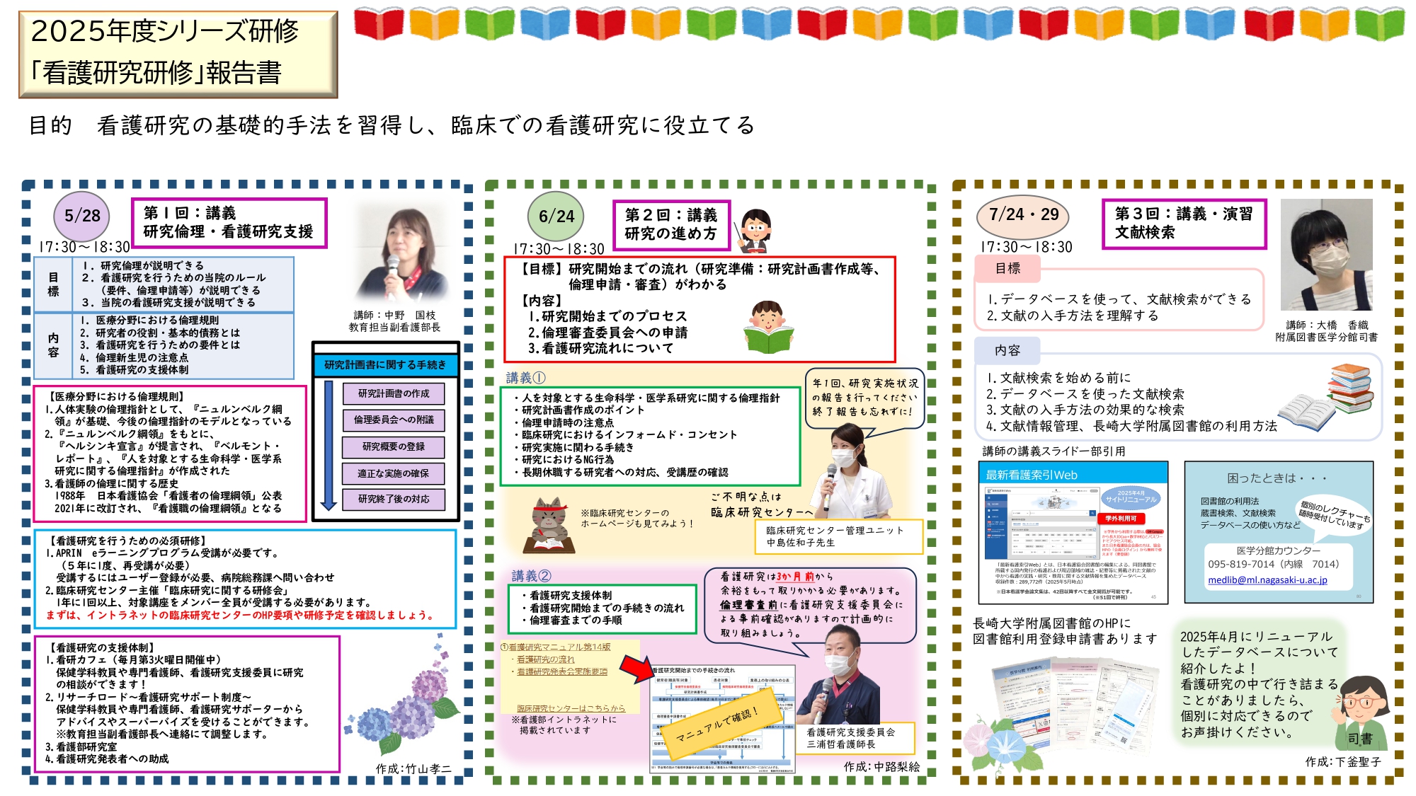 「看護研究の基礎的手法を習得し、臨床での看護研究に役立てる」を目的に、看護研究のスペシャリストを講師陣を迎え、第1回~第6回のシリーズ研修として開催しました。看護研究の支援や進め方、文献検索、文献の読み方について学びを深めました。詳細は報告書をご覧ください。