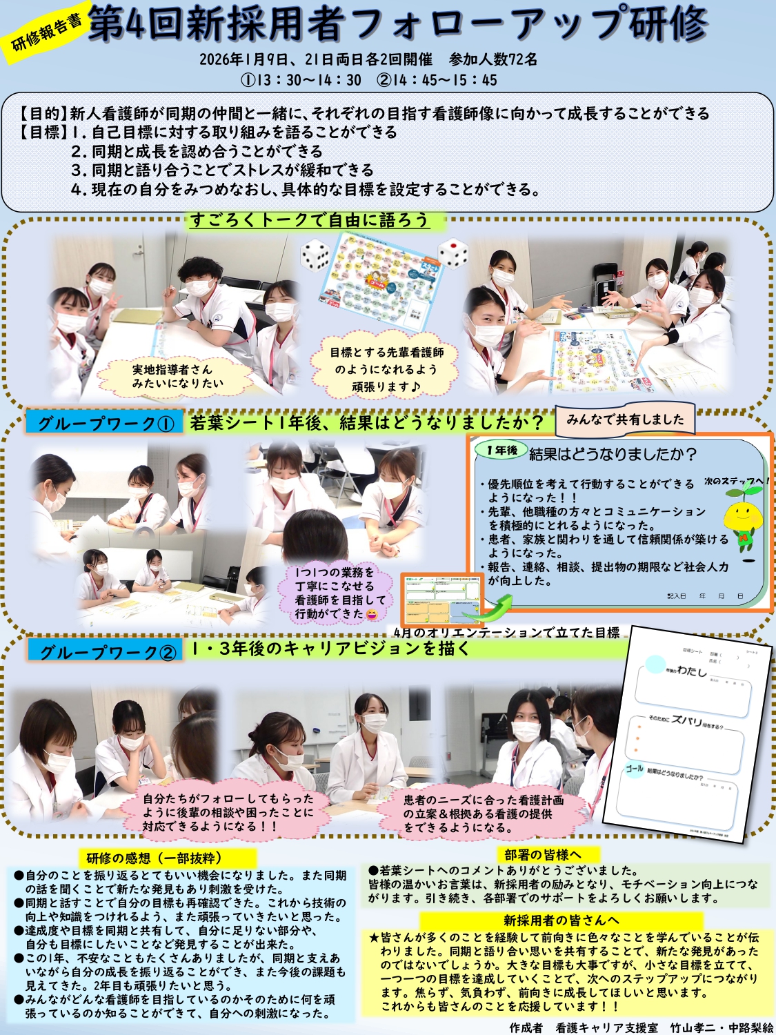 新人看護師が同期と共に成長することを目的に研修を実施しました。目標への取り組みを語り合い、互いの成長を認め合うことでストレスの緩和につながり、安心して自分を見つめ直す機会となりました。さらに新たな目標を立てることができ、今後の成長につながる有意義な研修となりました。